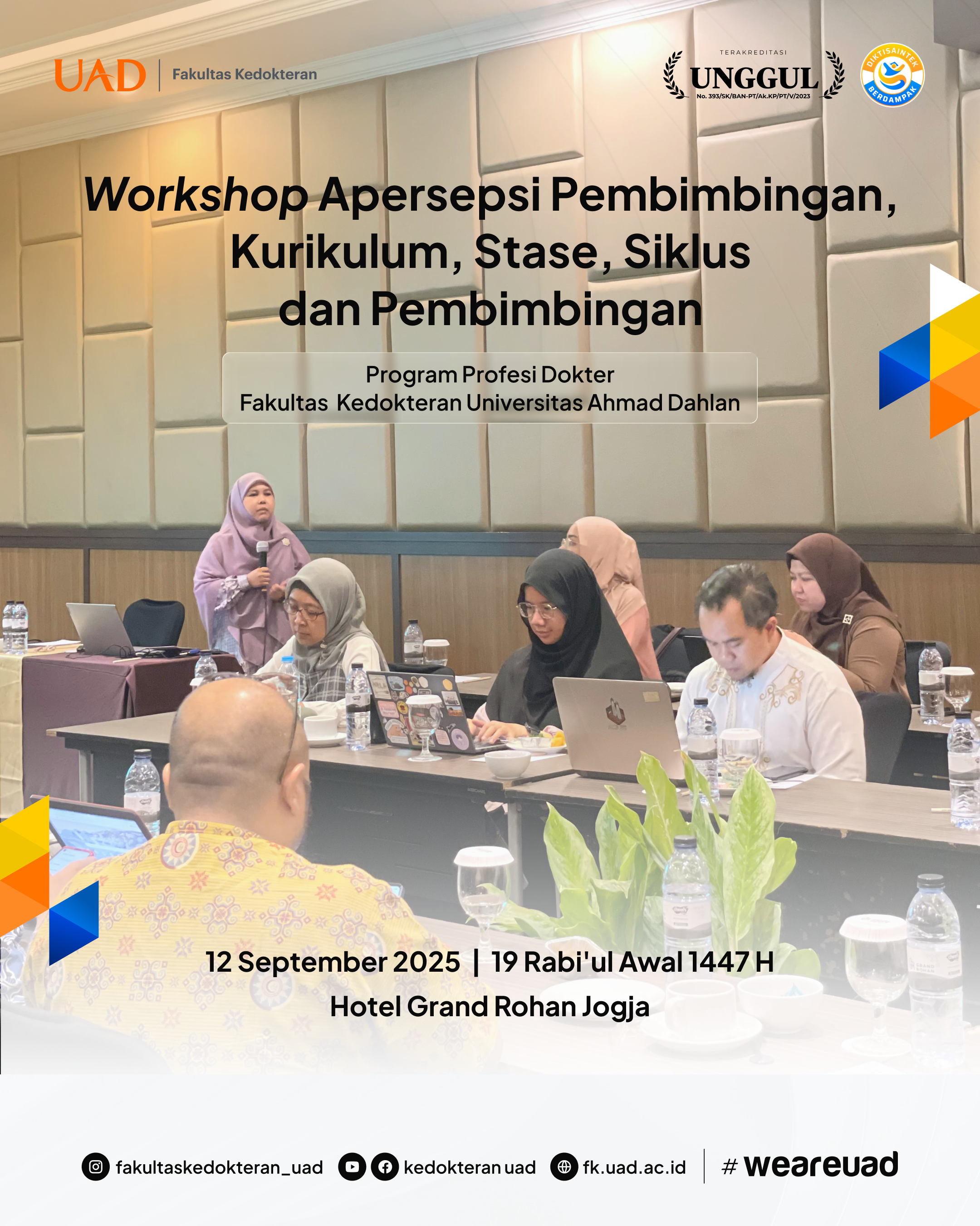 Program Profesi Dokter Fakultas Kedokteran UAD menggelar “Workshop Apersepsi Pembimbingan, Kurikulum, Stase, Siklus, dan Pembimbingan.” Workshop ini bertujuan untuk memperkuat kualitas kurikulum, siklus pembelajaran, hingga peran dosen pembimbing dalam mendukung terselenggaranya pendidikan profesi dokter yang berkualitas.