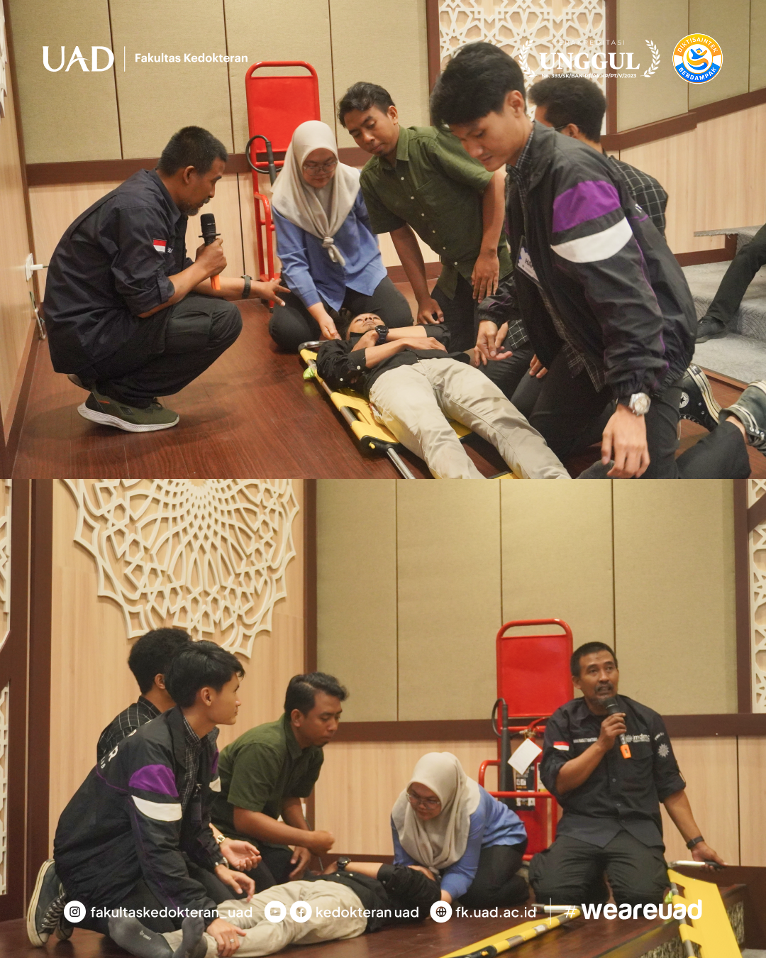 Bantul, Sabtu, 18 Oktober 2025 – Fakultas Kedokteran Universitas Ahmad dahlan dan Lembaga Resiliensi Bencana Muhammadiyah (LRB MDMC) Pimpinan Wilayah Muhammadiyah (PWM) Daerah Istimewa Yogyakarta menggelar Latihan Gabungan Klaster Kesehatan Emergency Medical Team (EMT). Bertempat di Amphiteater dan  area gedung Fakultas Kedokteran UAD, kegiatan ini merupakan kelanjutan  kegiatan Pelatihan Pendalaman Materi Kebencanaan  pada tanggal 11 dan 12 Oktober 2025. Dengan jumlah dan peserta yang  sama pada kegiatan sebelumnya,  kegiatan ini menjadi  bagian dari upaya berkelanjutan dalam memperkuat kapasitas relawan kesehatan agar mampu memberikan respon cepat, tepat, dan beretika kemanusiaan dalam menghadapi situasi bencana.